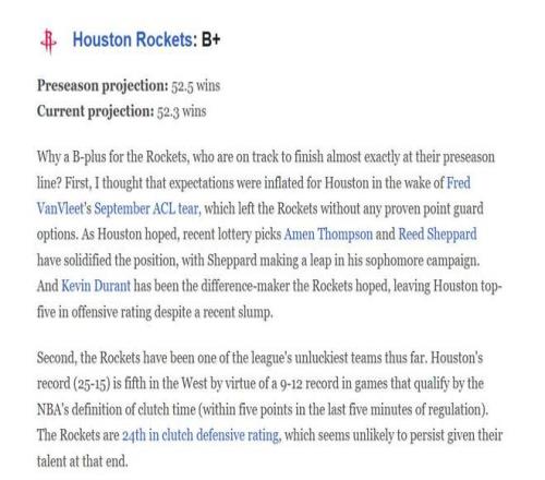 火箭隊(duì)常規(guī)賽前41場比賽已經(jīng)打完,權(quán)威美媒ESPN給出B+高評分。