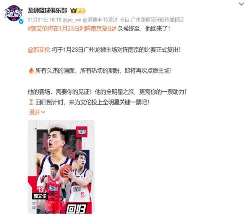 官宣復(fù)出!只打2場,郭艾倫還在爭取全明星