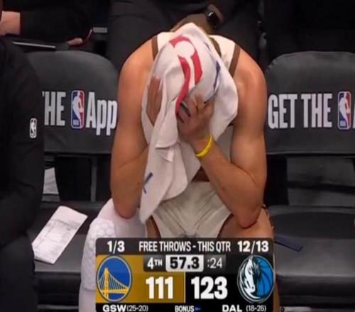 末節(jié)垃圾時(shí)間,坐在替補(bǔ)席的庫(kù)里先是眼神空洞望著已經(jīng)失去懸念的記分牌,接著用毛巾將頭捂了起來(lái),無(wú)奈之情溢于言表。