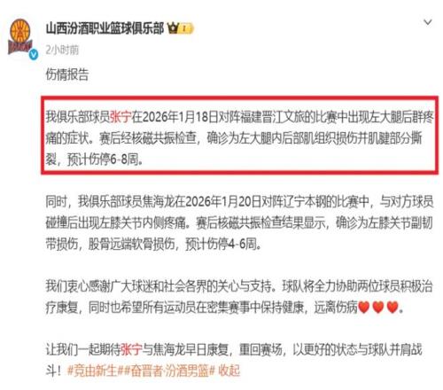 至少傷停6周!張寧嚴(yán)重拉傷,山西男籃官宣