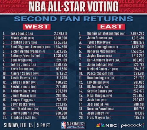 北京時間1月7日公布的2026年NBA全明星球迷投票次輪結(jié)果顯示,阿夫迪亞得票1224109位列西部第七,力壓詹姆斯(1059855)和杜蘭特(997386)兩位超巨,因此引起了一些爭議。