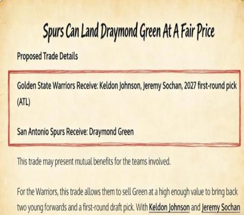 美媒《Fadeaway World》撰文提出了一套交易方案,他們建議勇士將格林送到馬刺,換回凱爾登、索漢以及一個2027年的首輪簽。