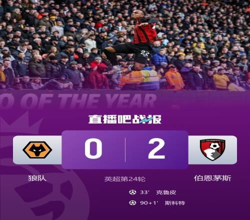 體育播報(bào)2月1日宣 北京時(shí)間23:00,英超第24輪狼隊(duì)vs伯恩茅斯,比賽在莫利紐球場(chǎng)打響!上半場(chǎng),馬特烏斯·馬內(nèi)打進(jìn)一球,但是隊(duì)友越位在先被判無(wú)效!克魯皮世界波破門!下半場(chǎng),佩特洛維奇神撲救險(xiǎn),耶森·莫斯克拉頭球中柱!斯科特補(bǔ)時(shí)幫助櫻桃再下一城!最終,狼隊(duì)0-2不敵伯恩茅斯,遭遇英超兩連??;伯恩茅斯近4輪3勝1平保持不敗。