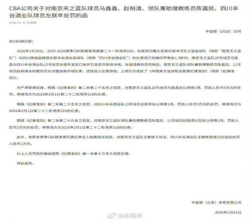 CBA公司發(fā)布公告,因臨近比賽結(jié)束時發(fā)生沖突,同曦男籃球員馬鑫鑫被停賽1場且罰款人民幣5萬元;四川男籃球員左朕年被停賽1場且罰款人民幣5萬元;同曦男籃領(lǐng)隊兼助教陳嘉凱、球員趙柏清分別被停賽1場且罰款人民幣2萬元;依照本賽季CBA聯(lián)賽賽風(fēng)賽紀責(zé)任人制度相關(guān)規(guī)定,同曦男籃主教練王世龍、四川男籃主教練楊城分別被追加處罰人民幣1萬元。