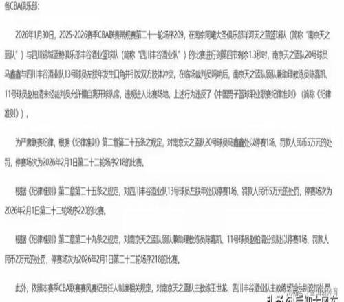 剛剛,CBA公司開(kāi)出罰單,根據(jù)《紀(jì)律準(zhǔn)則》第二章第二十五條之規(guī)定,對(duì)南京同曦馬鑫鑫處以停賽1場(chǎng)、罰款人民幣5萬(wàn)元的處罰;對(duì)南京同曦領(lǐng)隊(duì)兼助理教練員陳嘉凱、11號(hào)球員趙柏清分別處以停賽1場(chǎng)、罰款人民幣2萬(wàn)元的處罰;對(duì)南京同曦主教練王世龍,罰款1萬(wàn)處罰。