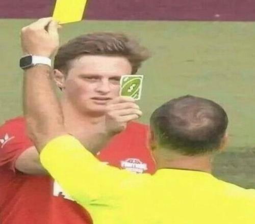這張梗圖的來源是2023年的一場明星網(wǎng)紅慈善賽,知名網(wǎng)紅Max Fosh因被抓到犯規(guī),讓前英超裁判克拉滕伯格亮出一張黃牌警告,但Fosh出示了綠色反轉(zhuǎn)卡,引得現(xiàn)場大笑。