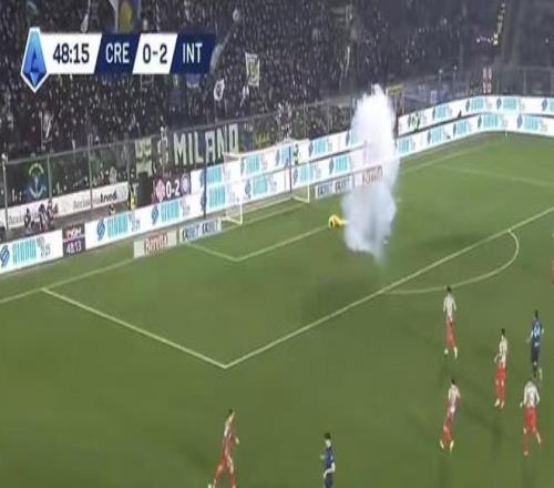 比賽第49分鐘,國(guó)際米蘭左路迪馬爾科持球準(zhǔn)備進(jìn)攻,突然一片煙霧出現(xiàn)在屏幕上方,克雷莫內(nèi)塞門將奧代羅痛苦到底。當(dāng)時(shí)狗哥和所有國(guó)米球迷的想法應(yīng)該是一樣的——要壞,這邊兒看臺(tái)可都是國(guó)米球迷,一旦奧代羅受傷嚴(yán)重,極有可能比賽會(huì)被立即終止,這對(duì)于一直掌控比賽的國(guó)際米蘭來(lái)說,徒增變數(shù),絕對(duì)不是好事。