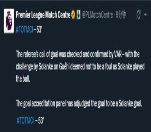 而英超官方也宣布,索蘭克對(duì)格伊的接觸不構(gòu)成犯規(guī),因?yàn)榍罢吲龅搅饲?。進(jìn)球認(rèn)證小組已經(jīng)判定該進(jìn)球是索蘭克的進(jìn)球。