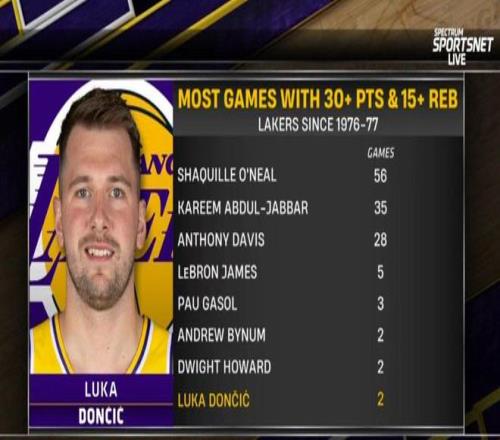 此役,東契奇還創(chuàng)下了紀錄。轉(zhuǎn)播方數(shù)據(jù)顯示,這是東契奇的湖人生涯第2次30+15板!追平德懷特霍華德、拜納姆并列第6,奧尼爾以56次高居第1。